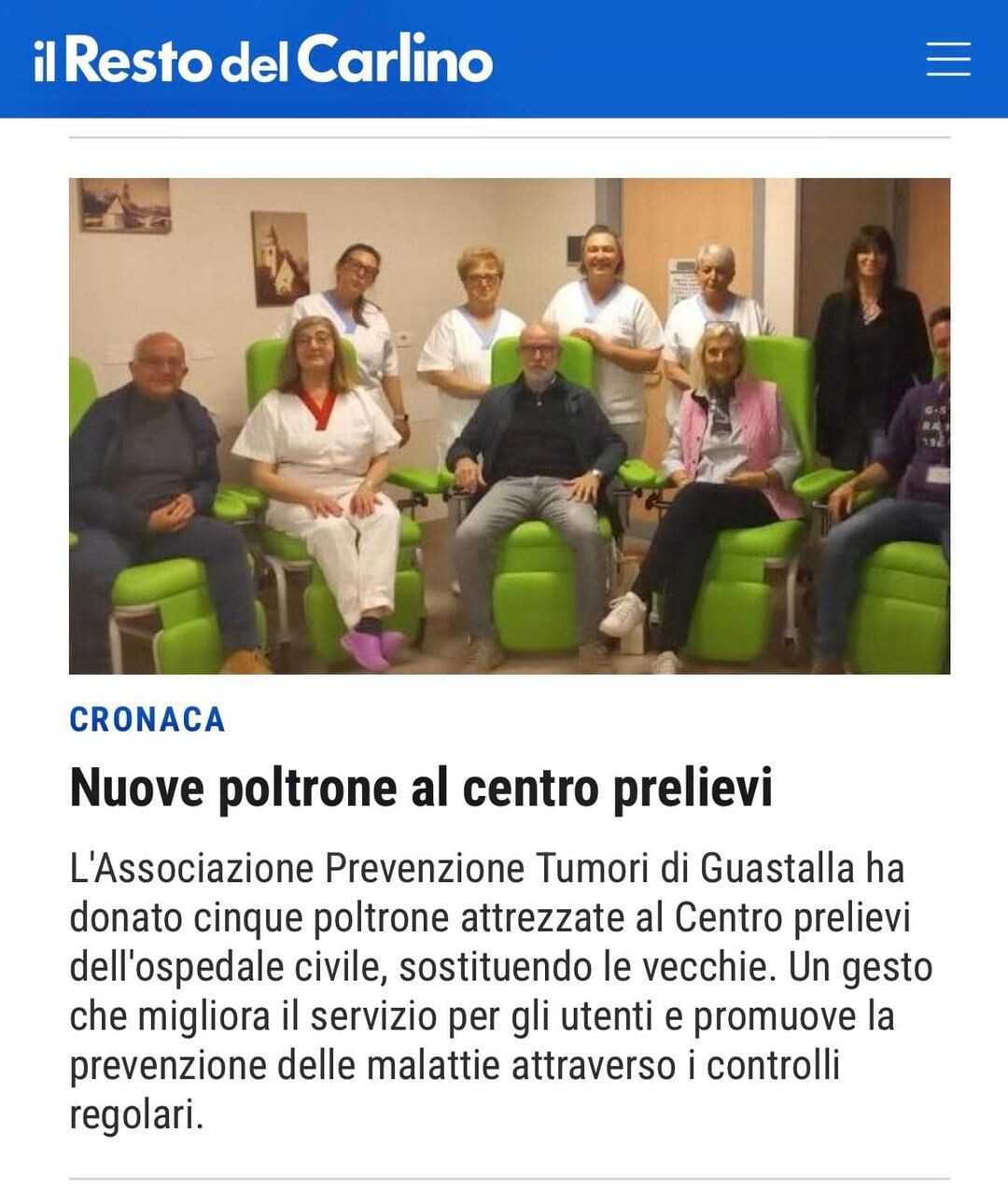 L'Associazione Prevenzione Tumori di Guastalla ha effettuato un'importante donazione al Punto Prelievi dell'Ospedale Civile, consegnando 5 nuove poltrone per prelievo che hanno sostituito le precedenti, obsolete e non più adeguate allo scopo. Le nuove sedute consentono un maggior comfort per l’utente e sono dotate di dispositivi di sicurezza quali ruote basculanti e un sistema completamente reclinabile, molto utili per l'assistenza in caso di malessere.